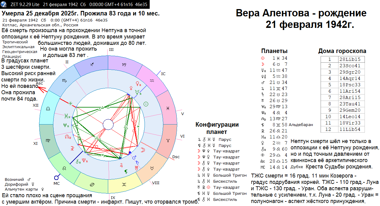 Советская и российская актриса театра и кино, телевидения, театральный педагог, народная артистка России, лауреат госпремии СССР Вера Алентова внезапно умерла 25 декабря 2025г. Ей стало плохо после посещения траурной церемонии прощания с актёром театра Маяковского. Срочно вызвали скорую помощь. Вера Алентова скончалась в тот же день в больнице. Причина смерти - инфаркт. Но сначала писали в СМИ, что у неё оторвался тромб. Она прожила 83 года и 10 месяцев. 60 лет она служила актрисой в театре имени А.С.Пушкина в Москве. Её смерть, с точки зрения астрологии, классическая. Конечно, кто-то с её даты рождения пережил тот роковой день 25 декабря 2025г., но стресс от посещения траурного зала, где сильно витал дух смерти, заставил её так разволноваться, что, возможно, произошёл большой выброс адреналина в кровь, что привело к отрыву тромба и последующему инфаркту миокарда. В интернете писали, что ей советовали не идти на эту траурную церемонию, но она пошла. Поэтому вывод такой: после 80 лет, когда Нептун идёт в точной оппозиции к Нептуну рождения, надо всячески избегать стрессов, потому что человек с 80 лет и 11 месяцев в зоне высокой вероятности смерти. В этом возрасте бывает самое раннее прохождение транзитного Нептуна к Нептуну рождения человека. У большинства это наступает в 81- 83 года.