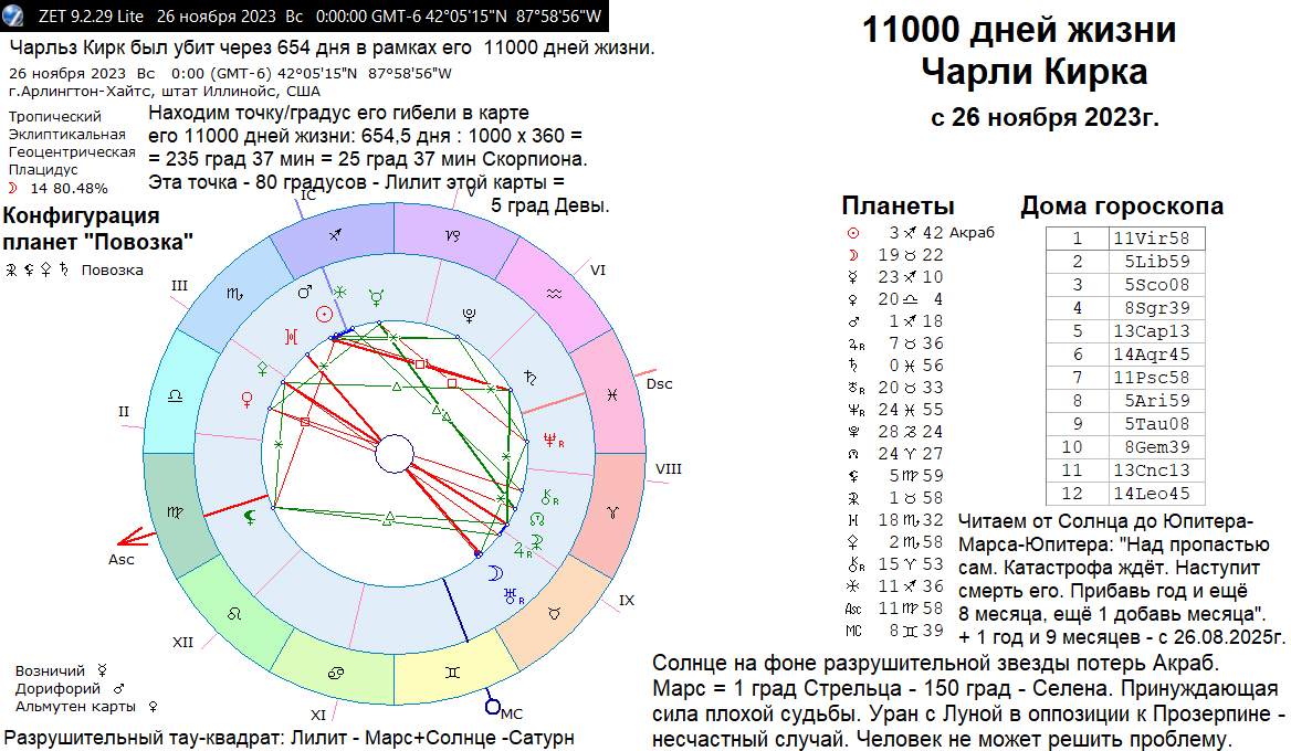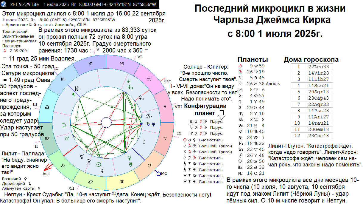 Архетипический гороскоп рождения (на полночь по месту рождения) с Лилит на МС (куспиде 10 дома) говорит о большим искушением властью. Он сам лепил из себя (и у него это получалось) харизматичную фигуру. Солнце в соединении с Юпитером в тригоне к Сатурну в точном соединении с астероидом Паллада) - политическая и иная карьера могла быть замечательной! Он умел найти богатых спонсоров для множества своих общественных проектов, которые требовали огромных денег, чтобы их раскрутить и сделать массовыми, на всю страну. Он хорошо ладил со стариками, а они в политике заправляли в США всем. Но даже точное соединение Сатурна с астероидом Паллада не уберегло его от гибели в молодом возрасте для политика. Его гороскоп разрушает почти точная квадратура от Плутона (24 град. Скорпиона) на соединение Сатурна и Паллады (23 град. Водолея). С другой стороны - это аспект трудоголика. А Чарли Кирк работал не покладая рук на ниве его проектов, которые часто шли со скрипом или не давали должной отдачи, но это и естественно: любые общественные проекты идут с переменным успехом. Полусекстиль Юпитер-Плутон всё же очень помогал ему раскрутить дело по крупному! И в конечном счёте, руководство всей Республиканской партии США и сам Дональд Трамп обратил внимание на Чарли Кирка, как на перспективного американского молодого политика, который может привести молодёжь в Консервативную партию США. Удачный брак (Луна секстиль Сев.Узел и тригон Южный Узел) на "Мисс Аризона США" и двое детей также работали на его репутацию, как примерного семьянина. Но читаем числа с Венера на Марс, потом на Меркурий и снова на Венеру и Марс: "За секунду удар ждёт и смерть его ждёт, когда зачитал речь свою". Читаем числа Венеры - Меркурия по кругу: "Из кампуса тебе выхода нет. Тебя видят/взяли на прицеле". Продолжаем читать снова Венеру и Меркурий по кругу и вниз до Сев. Узла: "Один подлец/sniper (снайпер) - так/сам тебя видит отлично! И щёлк! Сатурн: "Да, всё, цель поражена!" Далее читаем до Сев.Узла вниз: "И быстро, быстро побежал вниз". Если к кресту Судьбы = 9 град 42 мин Скорпиона прибавить 31 градус/31 год жизни, то мы получим его прогрессивный Крест Судьбы в 31 год в тригоне к его МС и Лилит рождения. Тригон (хороший аспект) означает, что фатальность (Крест Судьбы) входит, как по маслу! Причём ни одна планета в день его гибели, 10 сентября 2025г., не стояла в 10 градусах. А вот 7-8 сентября 2025г. Меркурий шёл по 10 градусам Девы, включая квадрат на Крест Судьби Кирка в его 31 год. По всей видимости, 7-8 сентября 2025г. решалась его судьба: выступать или нет? Возможно, что и его убийца принял окончательное решение или узнал о выступлении Чарли Кирка перед студентами в кампусе Университета 7-8 сентября 2025г. В любом случае, отсутствие точного аспекта в день гибели всегда создаёт огромную проблему для предсказания событий. Читаем числа планет от Марса до Урана: "Опрометчивость тебя погубила!". Или читаем числа с конца Марса снова на Уран: "Опрометчивость - и тебя она погубила". Однако он мог погибнуть и в автокатастрофе и в авиакатастрофе. Всё это, как и слово опрометчивость имеет 14 букв. Без умения читать числа гороскопа, астролог будет только молчать или расскажет только строго по гороскопу. А умение читать числа - это наука Астроцифрология, которую придумал и разработал я. Конечно, она подразумевает множества вариантов прочтения чисел, но в 
