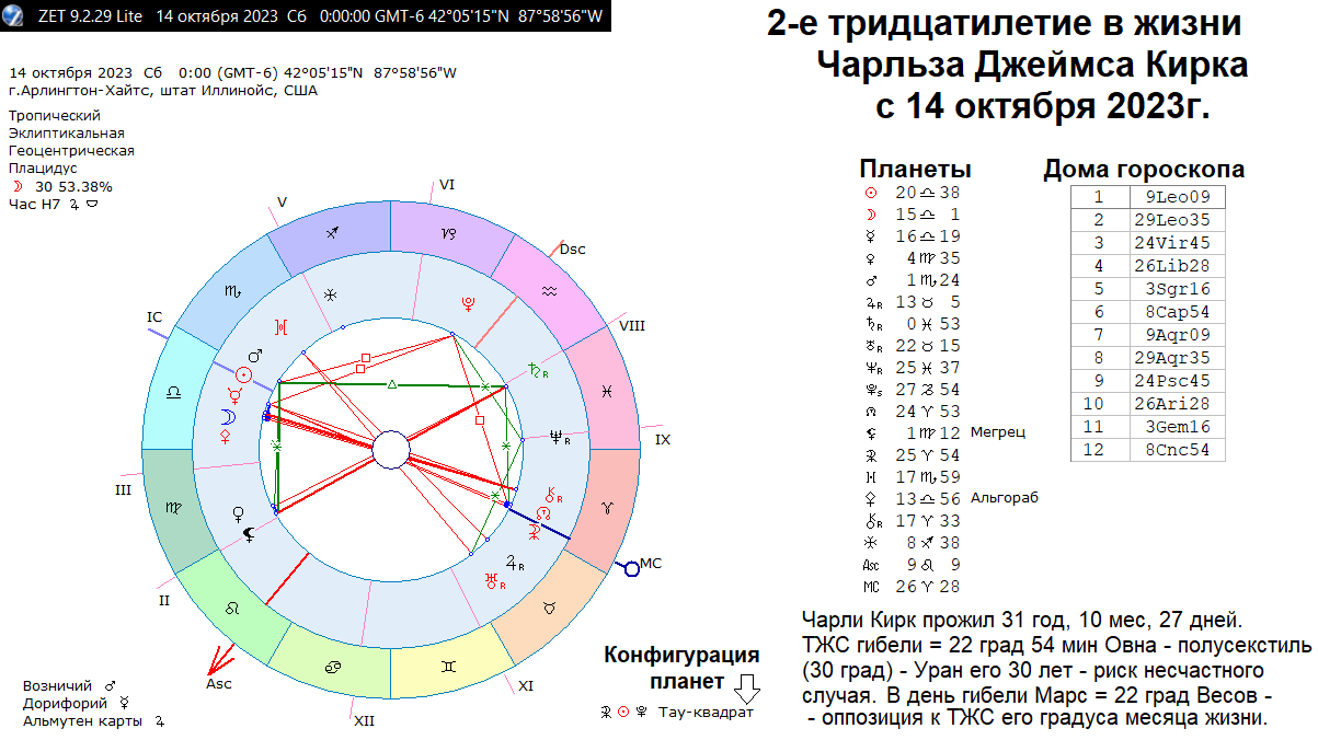 ТЖС гибели Чарльза Кирка = 22 град 54 мин Овна - 100 градусов - его Селена рождения = 12 град 51 мин Козерога. Аспект очень точный! Почти до минут. Сентагон (100 градусов) - переворот в жизни в худшую или лучшую сторону. Если бы пуля убийцы его только зацепила, как это было с Трампом во время 1-го на него покушения 13 июля 2024г., то врачи (Селена) спасли Чарли Кирка. Но стрелок попал очень метко в шею Кирка, и кровь хлынула, как из ведра, на глазах у всех. В негативе Селена означает жертвенность, удар в судьбе, фатальность, что и произошло с Чарли Кирком 10 сентября 2025г. в 12:10. Это политическое убийство вызвало большой резонанс в США. Если к Марсу рождения Кирка = 11 град Скорпиона прибавить 31 градус/31 лет = 12 градусов Стрельца. Его Марс в 31 год оказался на Оси Америки. С одной стороны, это его активность в разъездах по стране. А с другой стороны, риск гибели или ранения. Для того, чтобы лучше понять, что случилось с Чарли Кирком, строим гороскоп его 2-го 30-летия жизни. Его можно строить на место рождения человека, даже если он давно живёт в другом месте. Эта карта по месту рождения всё равно работает.